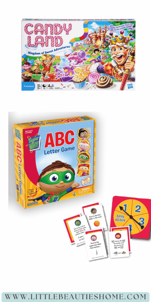 This may be a lesser known game but absolutely a great learning game for younger kids. We played this game SO much over the years! Based off the PBS show Super WHY, this game helps kids with letter recognition, phonics, early rhyming practice as well as some early word reading. The characters are cute and the board is colorful making it one of our early board game favorites.